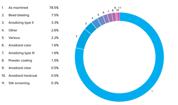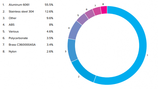 數(shù)控服務(wù)的新類別表明,鋁是最常用的材料,占比55.5%。不銹鋼304占第二位,為12.6%,其他排在第三位,占9.6%,排名第四的ABS占8%。