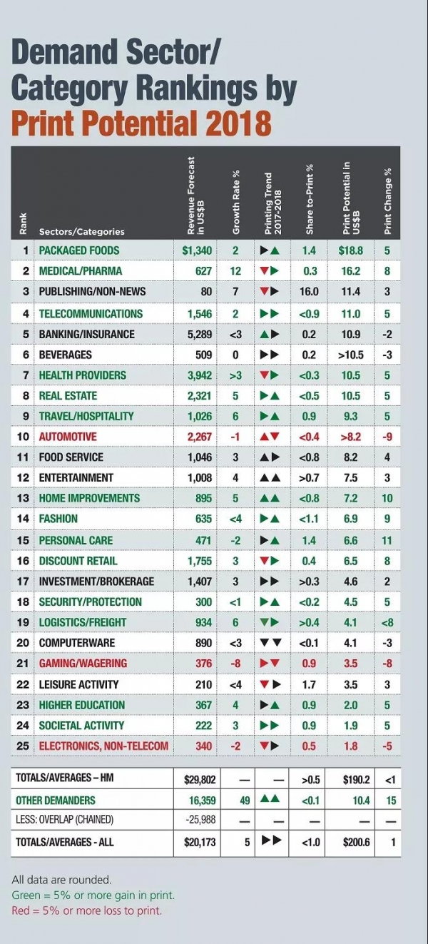 在這25個(gè)行業(yè)(市場)中,印刷需求排在前三位的是:包裝食品、醫(yī)療/制藥和出版