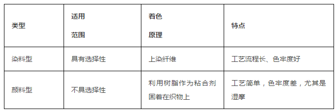 2. 根據(jù)面料的材質(zhì)進(jìn)行選擇墨水,不同的面料使用不同的墨水,正確的使用墨水,對(duì)面料的色牢度、色彩都有很好的表現(xiàn)。數(shù)碼印花墨水可分為染料型墨水和顏料型墨水(涂料),其特點(diǎn)如表中所示: