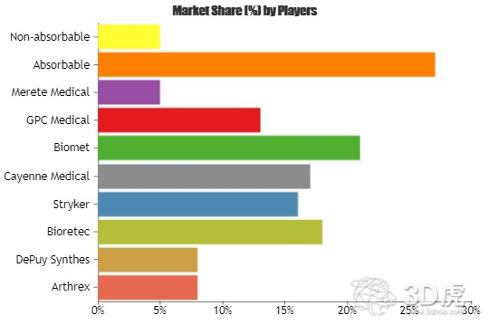 此外,報告還對美國、北美、歐洲、亞太、南美、中東和非洲等主要地區(qū)進行了分析,以及對Arthrex、DePuy Synthes、Bioretec、Stryker、Cayenne Medical、Biomet、GPC Medical、Merete Medical、Absorbable等進行了分析。報告對近年來全球和美國3D打印醫(yī)療器械的增長因素、劣化原因以及擴大市場的不同機遇和策略給出了清晰的認(rèn)識。