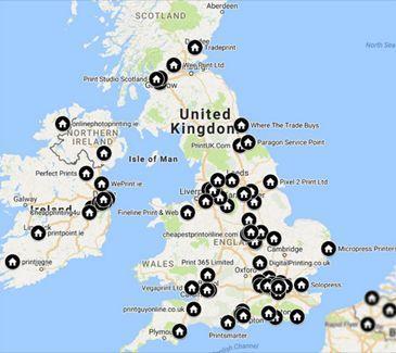英國(guó)有70多家網(wǎng)絡(luò)印刷供應(yīng)商,其中大多數(shù)位于倫敦和利物浦附近;來源:maps.google.com