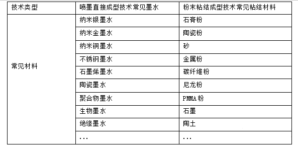 目前噴墨3D打印墨水多種多樣,可粘接材料五花八門,以下表格列舉了一些常見的材料: