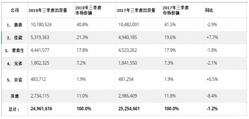 全球打印外設(shè)設(shè)備(HCP)市場三季度出貨量下降1.2%
