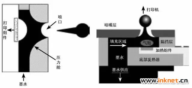 當(dāng)打印機(jī)收到打印信號后,打印數(shù)據(jù)驅(qū)動電路,對打印頭施加電脈沖信號,打印頭內(nèi)的電熱元件會迅速升溫,使其內(nèi)部的墨水溫度急速上升,并氣化形成小氣泡,持續(xù)的預(yù)熱使氣泡膨脹,內(nèi)部的壓力將墨水從噴嘴中擠出,電熱元件降溫氣泡開始冷卻,墨水收縮回到噴頭內(nèi),在噴嘴處形成的墨滴噴到打印的介質(zhì)表面,形成圖案或者字符。