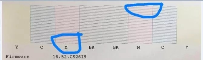 例如打印一個(gè)只有C、Y、BK組合的圖片,M一直沒(méi)噴墨,打印完后看M色噴孔測(cè)試條是否完整無(wú)缺。