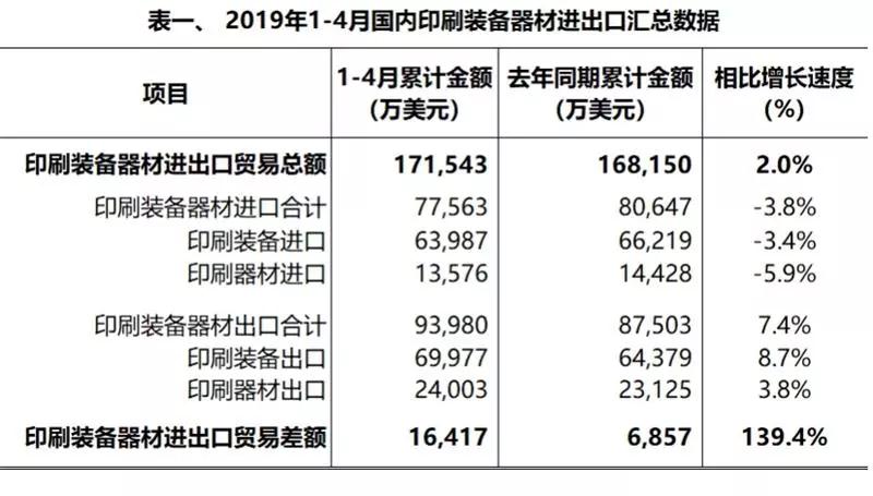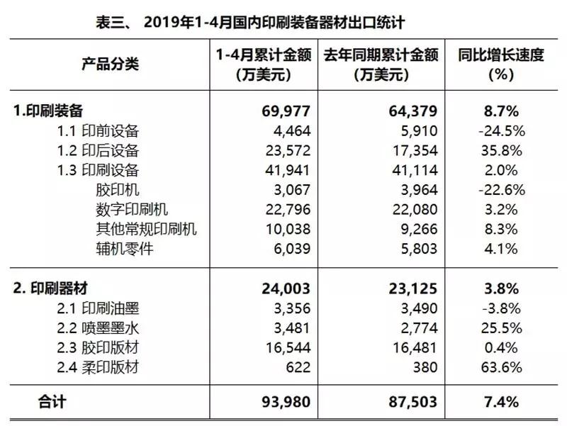 2019年1-4月國內(nèi)印刷裝備出口7.00億美元,同比增長8.7%。