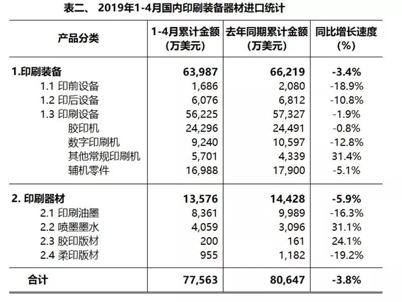2019年1-4月印刷裝備進(jìn)口6.40億美元,同比下降3.4%。