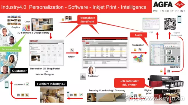 現(xiàn)在我們來看工業(yè)4.0,它需要控制整個生產(chǎn)過程。前端軟件解決方案(例如愛克發(fā)軟件StoreFront™, PrintSphere™ )維護(hù)端對端流程,為客戶和設(shè)計庫提供個性化服務(wù),將訂單轉(zhuǎn)換為本地打印商的打印工作,交付當(dāng)?shù)丶揖庸尽_B接的生產(chǎn)力工具(如愛克發(fā)Asanti™)將把設(shè)計轉(zhuǎn)換為標(biāo)準(zhǔn)化可打印的檔案。每一個獨(dú)特的設(shè)計將于易于檢索的隱形浮水印中包含所有的信息。追蹤與記錄(Track&Trace)信息可以是客戶識別碼、訂單信息、寄送地址、生產(chǎn)流程、打印日期/時間、商家識別…等。通過一次性的授權(quán)將原始資料庫的設(shè)計復(fù)制至云保護(hù)。