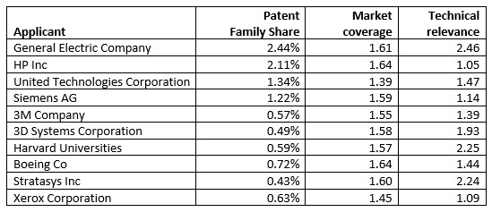 技術(shù)相關(guān)性指標是指專利被引用的數(shù)量,高技術(shù)相關(guān)性值可被認為是特定細分市場中的領(lǐng)先技術(shù)。如表1所示,前10名專利所有者的3D打印專利組合具有高技術(shù)相關(guān)性(數(shù)值高于1,代表高于平均值)。在前10名專利申請者中,GE、Stratasys和哈佛大學的技術(shù)相關(guān)性得分最高。
