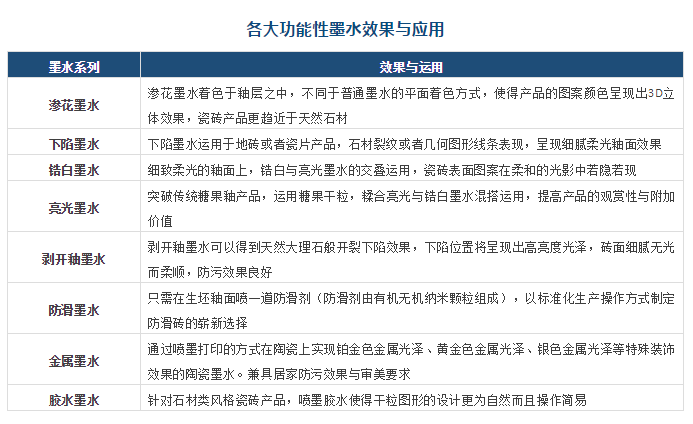功能性墨水在使用上主要定義為,將特殊效果釉料以墨水的形態(tài)通過噴墨機操作施釉,借以滿足瓷磚產(chǎn)品標準化生產(chǎn)需求。因此,功能性墨水的問世,是釉用材料的一場革命。