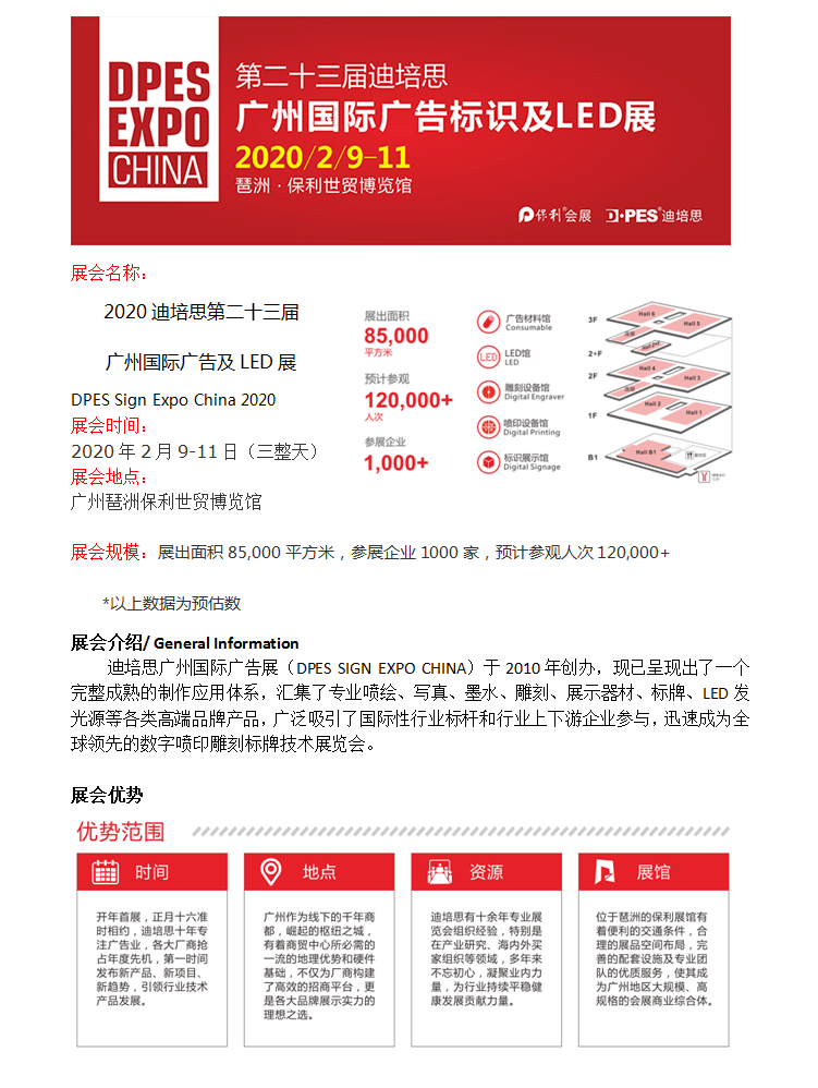 2019年2月23日,第二十一屆迪培思廣州國際廣告標識及LED展,在琶洲保利世貿(mào)博覽館圓滿落幕!此屆展會規(guī)模宏大,8萬多平米的展出面積,1000+海內(nèi)外參展商,為期四天的展會共接待海內(nèi)外專業(yè)買家4萬多人,盛況空前,開年首場廣告盛會再續(xù)輝煌!