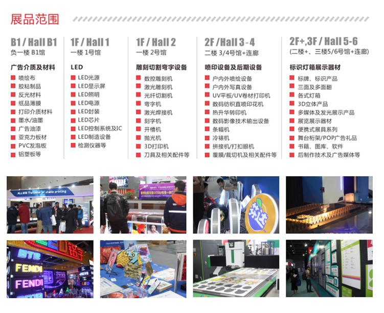 展會展品豐富新穎,按類別分為五大展區(qū)七大展館,匯集了廣告介質(zhì)及材料、LED發(fā)光源、雕刻設備、噴印設備、標識燈箱展示器材等各類高端品牌產(chǎn)品,覆蓋了整個廣告制作產(chǎn)業(yè)鏈。