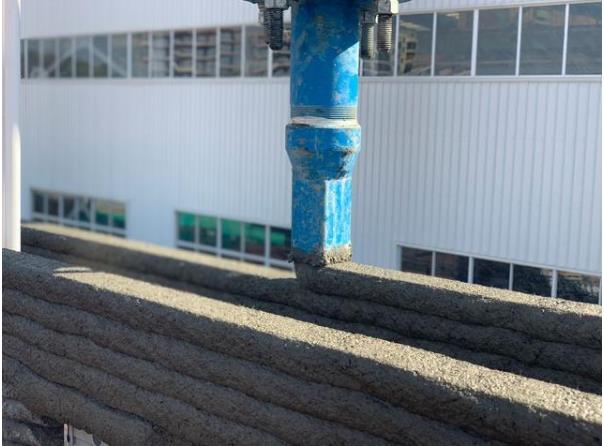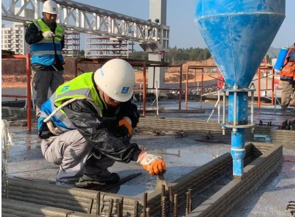 傳統(tǒng)工藝在主體施工中涉及到模板、鋼筋和混凝土三個方面,3D打印技術(shù)的所有工藝也是圍繞著這三個內(nèi)容進行的。目前3D打印還無法打印鋼筋,鋼筋布置還需要依靠人工。但混凝土澆筑所需要的模板,在3D打印建筑的施工現(xiàn)場卻沒有,因為3D打印頭里噴出的混凝土可不一般。因此,在打印過程中,隨著墻體的不斷長高,需要按照圖紙去加裝鋼筋。