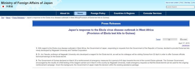 日本外務(wù)省關(guān)于向幾內(nèi)亞提供埃博拉檢測試劑盒的消息
