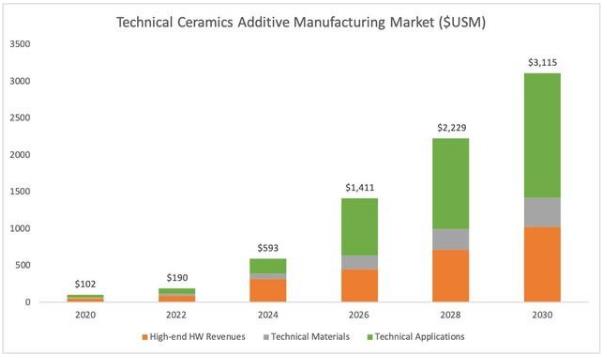 最新的調(diào)研報(bào)告《2020年陶瓷增材制造》預(yù)測(cè),到2030年,陶瓷的增材制造市場(chǎng)將增長(zhǎng)到31億美元,包括所有硬件、材料和相關(guān)零件收入。整個(gè)陶瓷市場(chǎng),包括所有與傳統(tǒng)陶瓷(砂和水泥)相關(guān)的收入,到同年可能達(dá)到48億美元。