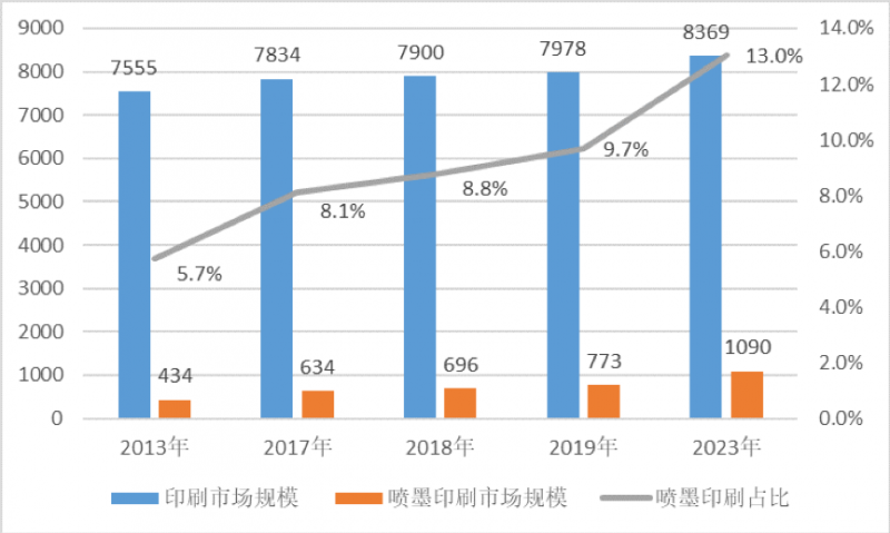 據(jù)美國Smithers Pira公司的數(shù)據(jù)統(tǒng)計,2013年,全球噴墨印刷市場的規(guī)模為434億美元,在7555億美元的印刷市場總量中占比約為5.7%;