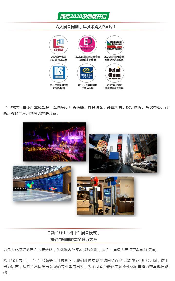 期待已久的聞信2020深圳展——LED CHINA 2020深圳站、2020深圳國際燈光音響及智能多媒體展、2020深圳國際商顯及視聽系統(tǒng)集成展、第十三屆深圳國際數(shù)字標牌展、第十九屆深圳國際廣告標識展、2020深圳國際商業(yè)零售與設計展,他們終于要來了!就在今年9月1-3日,深圳會展中心(福田區(qū)福華三路)!