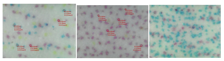 如上圖經(jīng)測量以點徑0.05mm為主,放大500倍。有少量0.03mm、0.04mm的墨點。整體墨點穩(wěn)定,但是墨點圓度有待提升。