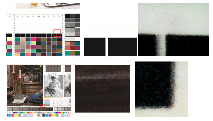 以上圖示放大50倍的情況下,觀察很明顯表現(xiàn)為深色色塊橫向縱向邊緣均疊印較好,顏色稍淺則橫向疊印優(yōu)過縱向疊印。