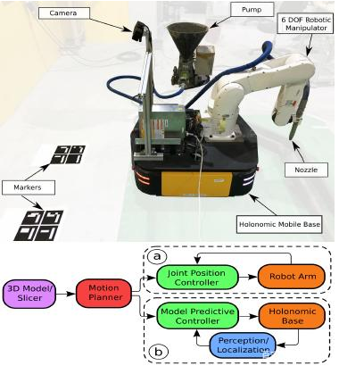 據中國3D打印網了解,建筑和構造最近已成為機器人技術的激動人心的應用領域。特別是,材料配方和機器人技術的快速進步使機器人的3D打印混凝土成為現(xiàn)場施工的有希望的技術。然而,可擴展性仍然是廣泛采用的重要障礙:打印系統(tǒng)(基于龍門式或基于臂式)通常比要打印的結構要大得多,因此很麻煩。最近,有人提出了一種移動打印系統(tǒng)(一種安裝在移動基座上的機械手)來緩解這一問題:通過移動基座,這樣的系統(tǒng)可以打印出比其自身更大的結構。然而,提出的系統(tǒng)只能在靜止時打印,從而對可以單次打印的結構的尺寸施加了限制。在這里,我們開發(fā)了一個實現(xiàn)移動打印范例的系統(tǒng),該系統(tǒng)可以用一個機器人打印任意大小的單件結構。這種發(fā)展需要解決針對移動3D打印的運動計劃,本地化和運動控制問題。該系統(tǒng)只需要一個機器人即可打印不同大小的單件結構,這也有助于確保更好的結構性能。