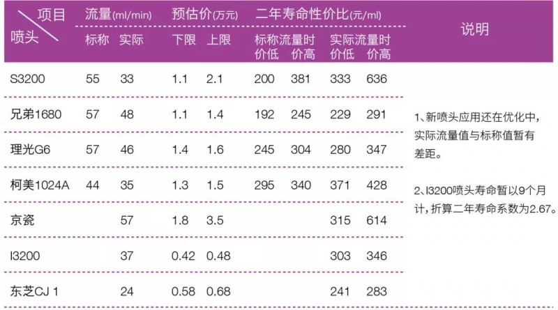 在表1中可見,若以二年的應(yīng)用壽命來看,目前S3200噴頭在幾個(gè)新噴頭中的性價(jià)比還不是很突出,但比傳統(tǒng)的京瓷噴頭來說還是有較大的優(yōu)勢。