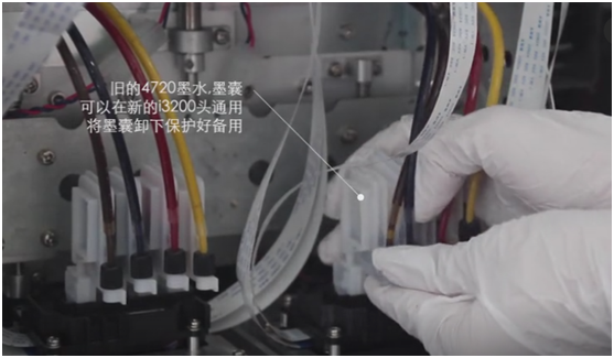 ⑧ 安裝墨囊于新的I3200噴頭,將之前置于一旁的墨囊按之前4720噴頭同樣的色序安裝。
