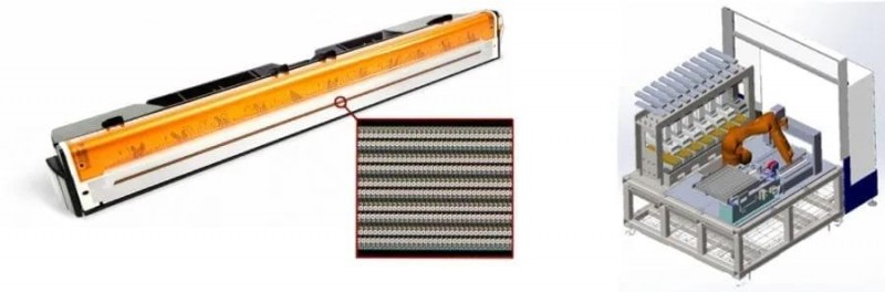 左:Duralink打印頭和1600 dpi下放大的5行噴嘴 右:DuraFlex全自動機器人裝配系統(tǒng)的一部分