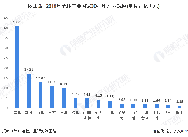 美國是3D打印產(chǎn)業(yè)的起源地,在全球3D打印市場中持續(xù)領(lǐng)先。以全球3D打印產(chǎn)業(yè)規(guī)模與各國3D打印設備出貨量占比進行測算可知,2019年美國3D打印產(chǎn)業(yè)規(guī)模為40.82億美元,全球范圍內(nèi),美國3D打印產(chǎn)業(yè)規(guī)模領(lǐng)先其他國家。