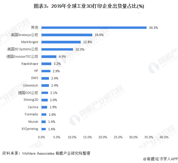 全球范圍內(nèi),美國3D打印技術(shù)先進,3D打印設備規(guī)模領(lǐng)先其他國家。據(jù)Wohlers Associates數(shù)據(jù),2019年美國3D打印機安裝量占全球34.4%,約為中國的3倍。