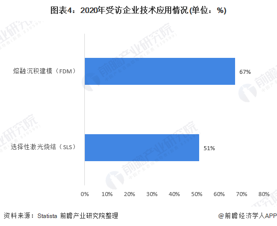 3D打印產(chǎn)業(yè)規(guī)模增長與3D打印技術(shù)密切相關(guān)。根據(jù)知名數(shù)據(jù)公司Statista于2020年6月3日公布的數(shù)據(jù),2020年,全球最常用的3D打印技術(shù)是熔融沉積建模(FDM),67%的受訪者在室內(nèi)使用該技術(shù)。選擇性激光燒結(jié)(SLS)是2020年第二大最常用的技術(shù),51%的受訪者通過外部服務采用這種技術(shù)。