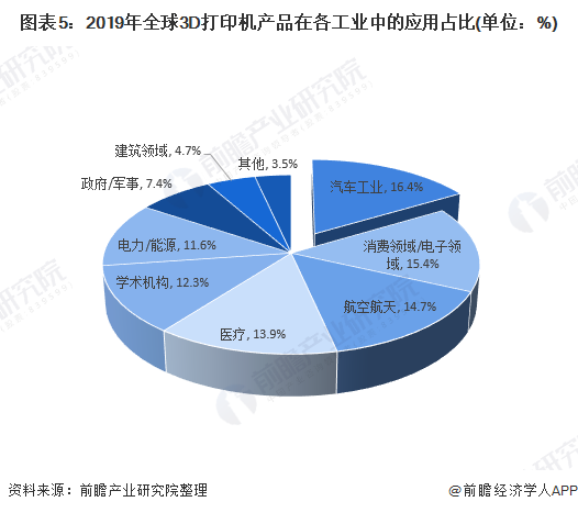 3D打印下游應用領(lǐng)域方面,據(jù)《Wohlers Report 2020》問卷調(diào)查顯示,目前工業(yè)中使用3D打印最多的行業(yè)是汽車工業(yè),遙遙領(lǐng)先,占比為16.4%。消費領(lǐng)域/電子領(lǐng)域和航空航天則緊隨其后,分別為15.4%和14.7%。
