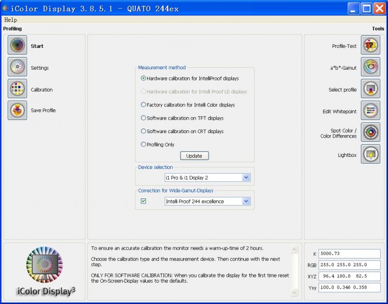 專業(yè)圖像顯示器一般可以配合專業(yè)的校正屏幕的色彩管理軟件(圖二),按照要求設(shè)定好參數(shù),用分光光度儀或者顯示器自帶的色度儀測量軟件顯示的色塊的Lab值,再由軟件生成一條顯示器的色彩配置文件,配置文件一般是用在顯卡驅(qū)動上或者寫到顯示器內(nèi)部的存儲器里。分光光度儀的精度會更好,專業(yè)顯示器自帶的色度儀可以更快捷的完成這個工作。
