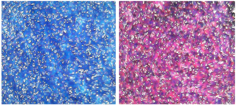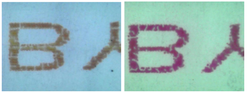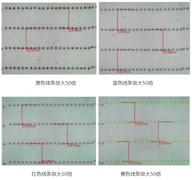 肉眼看上去沒有誤差,顏色飽和度好;在不同位置放大500倍顯示下,顏色密度足夠,沒有出現(xiàn)明顯的色差厚薄,說(shuō)明打印的過(guò)程是相對(duì)穩(wěn)定的。
