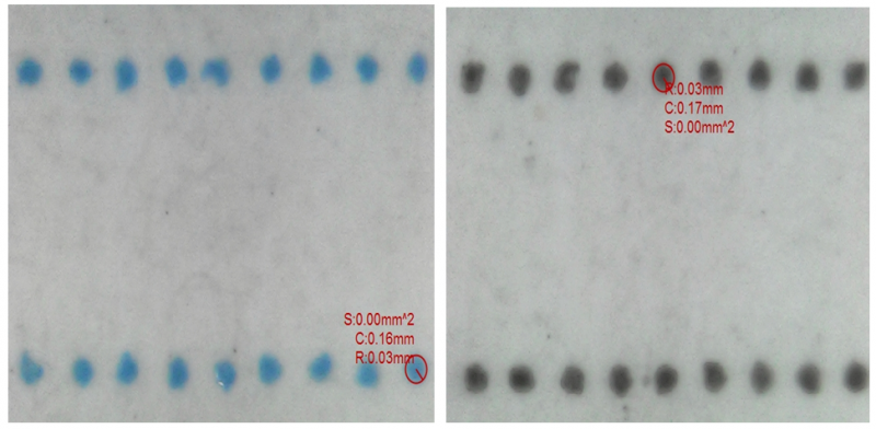 圓點(diǎn)放大500倍顯示下,點(diǎn)徑控制在0.03mm,效果基本一致,線路沒明顯跑路,沒有衛(wèi)星飛點(diǎn),圓度還可以有更好的改進(jìn)空間。