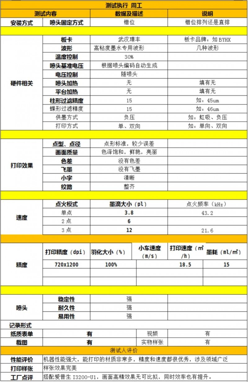彩白彩采用4pass,打印精度360x1200dpi,速度達(dá)到12㎡/h,測試圖片精細(xì),羽化效果好;燈片采用6pass,360x1800dpi的精度,打印速度16㎡,車貼采用4pass 打印速度達(dá)到24㎡/h;在單點小墨滴打印中,采用43.2HZ點火頻率,速度更快。多點打印模式下,點火頻率為21.6HZ 。