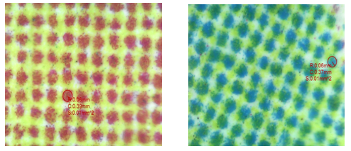 500倍放大顯示,點徑基本都控制在0.06mm,墨滴控制均勻,穩(wěn)定性較強(qiáng),墨點有輕微擴(kuò)散,工程師指出擴(kuò)散主要是材料和墨水方面的匹配問題。因為是在放大500倍的情況下看的,正常肉眼看是沒有任何問題的。