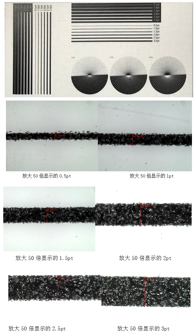 在4PASS測試下的線條墨滴測量分別是0.10mm,0.19mm,0.28mm,0.37mm,0.45mm,0.55mm,可以看到線條測量分別在0.08mm~0.10mm之間,線條打印得細(xì)致整齊,勾邊較規(guī)律。打印0.5pt細(xì)線時邊緣有少許飛墨,可以處理的更好些。