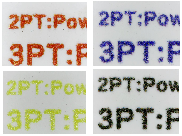 2pt和3pt小字在畫面上肉眼觀看清晰,不模糊。放大500倍,小字顯示較規(guī)律,看不到飛墨,飛墨情況處理的非常好。總體看,打印小字的效果優(yōu)秀,打印頭性能穩(wěn)定。