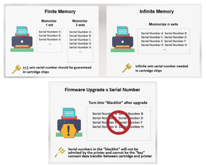 一開始,打印機(jī)只會(huì)存儲(chǔ)記憶近期安裝的耗材序列號(hào),且記憶的數(shù)量在一定范圍內(nèi)。而隨著技術(shù)的進(jìn)步,耗材序列號(hào)從一開始簡單的一串身份識(shí)別碼逐漸演變成了一段經(jīng)過特殊加密的代碼,而打印機(jī)也不再是單純的記憶一定數(shù)量的序列號(hào),逐漸發(fā)展成為能夠永久存儲(chǔ)并記憶所有曾上過機(jī)的序列號(hào)。