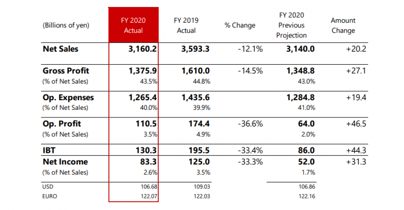 2020財年,佳能集團(tuán)總營收31,602億日元,同比下降12.1%;毛利13,759億日元,同比下降14.5%;凈利潤833億日元,同比下滑33.3%。