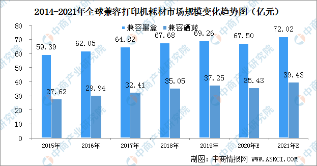 預(yù)計(jì)到2021年,全球兼容打印機(jī)耗材市場(chǎng)中,兼容墨盒市場(chǎng)規(guī)模將超70億元,兼容硒鼓市場(chǎng)規(guī)模達(dá)39.43億元。