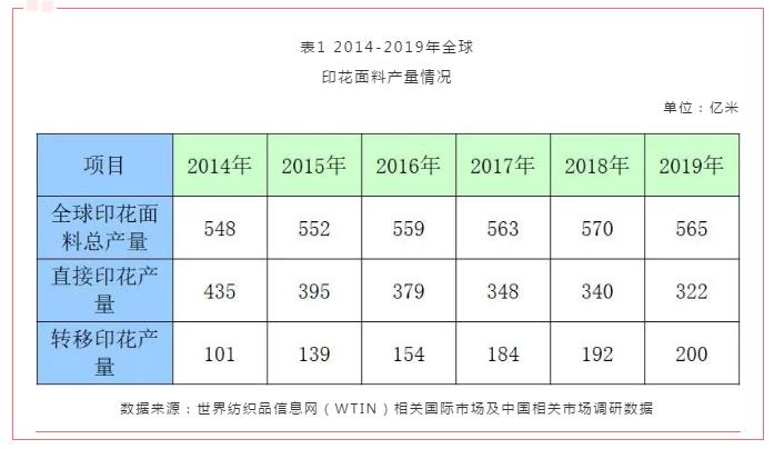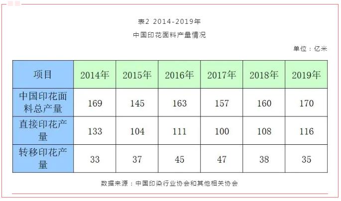 中國(guó)在全球紡織品印染加工中占據(jù)重要地位,中國(guó)印花面料產(chǎn)量約占全球的30%。2014-2019年,中國(guó)印花面料產(chǎn)量見(jiàn)表2。
