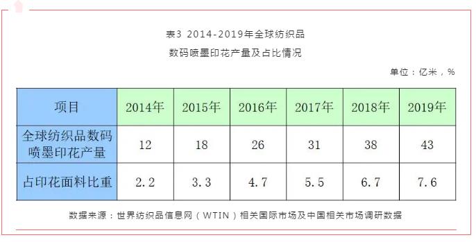 數(shù)碼噴墨印花經(jīng)歷了從“純打樣用途”到“大批量生產(chǎn)”的發(fā)展歷程。近年來(lái)隨著數(shù)碼噴墨印花在設(shè)備、墨水成本上的快速下降,打印精度和速度的大幅提升,以及數(shù)碼噴墨印花技術(shù)以其不需制版、花回長(zhǎng)、起印批量小、綠色環(huán)保等特點(diǎn)適應(yīng)當(dāng)前紡織品市場(chǎng)“個(gè)性化、快速反應(yīng)”的發(fā)展需求。數(shù)碼噴墨印花技術(shù)在印染行業(yè)的應(yīng)用不斷增加,市場(chǎng)份額不斷擴(kuò)大,見(jiàn)表3。