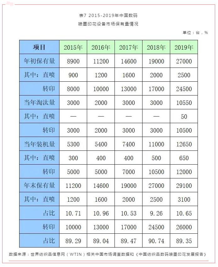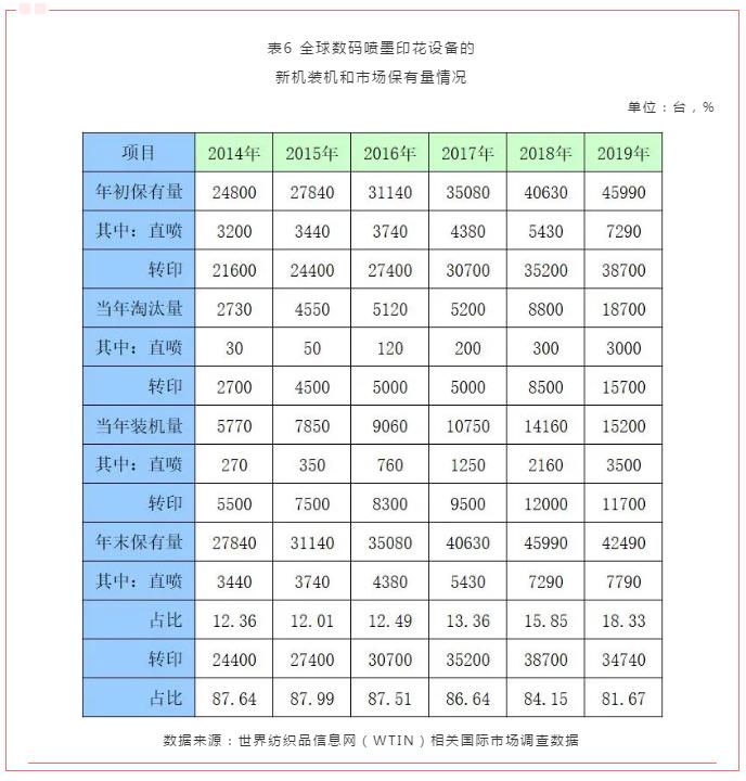2019年中國(guó)數(shù)碼噴墨印花設(shè)備進(jìn)入了淘汰高峰期,淘汰的10550臺(tái)數(shù)碼噴墨印花設(shè)備基本上是數(shù)碼轉(zhuǎn)移印花設(shè)備,與全球數(shù)碼轉(zhuǎn)移印花設(shè)備的淘汰形勢(shì)基本同步。