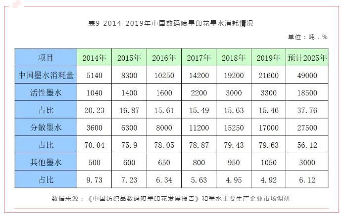 由表8可以看出,全球數(shù)碼噴墨印花墨水的消耗量逐年增加,2019年達(dá)到5.75萬(wàn)噸,五年來(lái)翻了近兩倍,其中活性墨水占比約20%,分散墨水占比約60%,酸性、涂料等其他墨水占比約20%。數(shù)碼噴墨印花墨水消耗量的變化反映了數(shù)碼噴墨印花技術(shù)的發(fā)展勢(shì)頭和前景。預(yù)計(jì)到2025年全球數(shù)碼噴墨印花墨水的消耗量將達(dá)到16萬(wàn)噸。