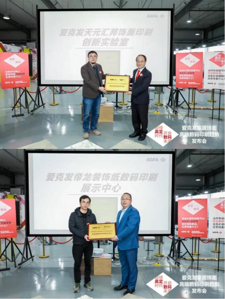 新設(shè)備與新技術(shù)的應(yīng)用與落地離不開(kāi)合作伙伴的信任與支持。本次活動(dòng),愛(ài)克發(fā)分別與天元匯邦、帝龍成立飾面印刷創(chuàng)新實(shí)驗(yàn)室和展示中心。