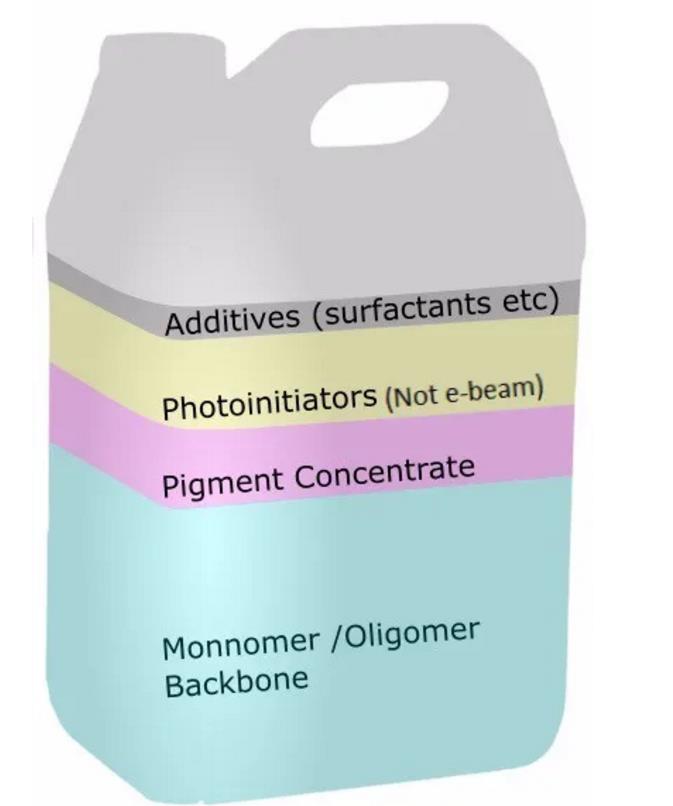 從應(yīng)用的角度來看,由于反應(yīng)性單體和低聚物材料的選擇令人難以置信,因此UV油墨的最大優(yōu)點是其可根據(jù)不同要求實現(xiàn)很高的可調(diào)性。如上圖所示,正是這些成分的混合物構(gòu)成了配方的主體,從而導(dǎo)致了固化膜的性能。