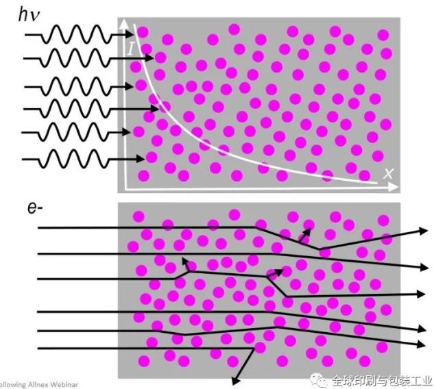 電子束固化是解決此問題的一種方法。在這些油墨中,交聯(lián)反應(yīng)是由高能電子而不是低能UV光子的相互作用引起的,這意味著不需要那些危害更大的光引發(fā)劑。如下所示,電子的滲透不受顏料沉積的影響,因此電子束非常適合高顏料涂料應(yīng)用,而更敏感的油墨可以通過調(diào)節(jié)電子能量來固化。在這兩種情況下,都可以實現(xiàn)極快的固化。