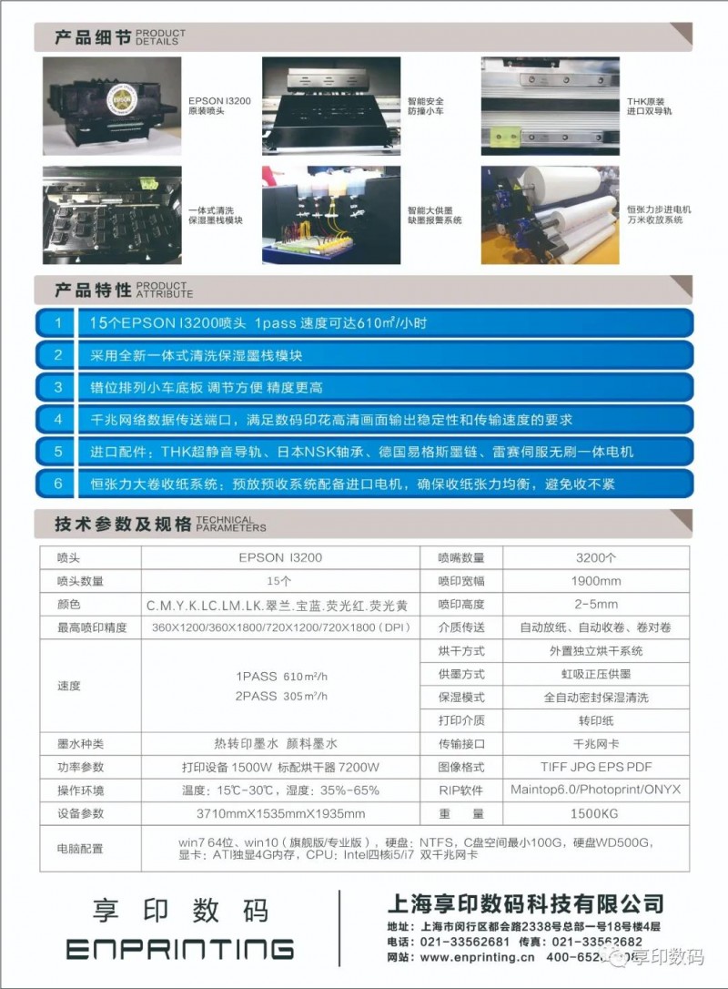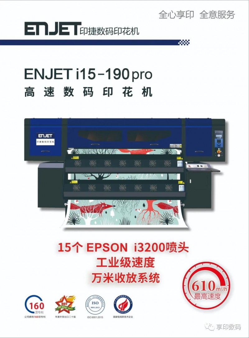 隨著數(shù)碼印花行業(yè)的高速發(fā)展,客戶對設(shè)備的穩(wěn)定生產(chǎn)指標(biāo)也越來越高,圍繞著產(chǎn)品的穩(wěn)定性,速度,精度,色彩,成本這幾方面,享印數(shù)碼印捷系列再度推出15噴頭工業(yè)級高速數(shù)碼印花機(jī)——印捷ENJET i15-190 pro,產(chǎn)品于2020年底已經(jīng)完成工廠內(nèi)部測試,2021年1月份開始交付客戶進(jìn)一步驗(yàn)證、完善,感謝第一批客戶的極力支持與厚愛,目前1.9m機(jī)型已經(jīng)進(jìn)入量產(chǎn)階段,在柯橋,南通,盛澤均有客戶案例,歡迎品鑒!