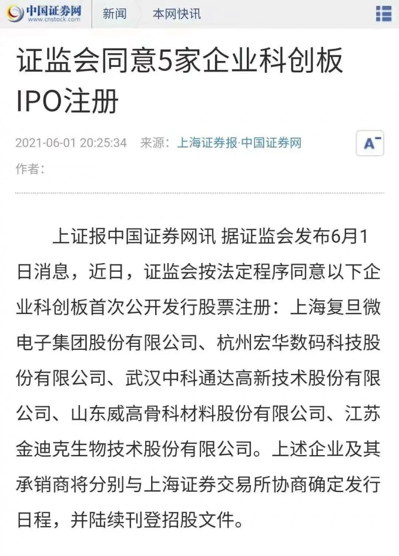 上證報(bào)中國(guó)證券網(wǎng)訊:據(jù)證監(jiān)會(huì)發(fā)布6月1日消息,近日,證監(jiān)會(huì)按法定程序同意以下企業(yè)科創(chuàng)板首次公開(kāi)發(fā)行股票注冊(cè):上海復(fù)旦微電子集團(tuán)股份有限公司、杭州宏華數(shù)碼科技股份有限公司、武漢中科通達(dá)高新技術(shù)股份有限公司、山東威高骨科材料股份有限公司、江蘇金迪克生物技術(shù)股份有限公司。上述企業(yè)及其承銷商將分別與上海證券交易所協(xié)商確定發(fā)行日程,并陸續(xù)刊登招股文件。